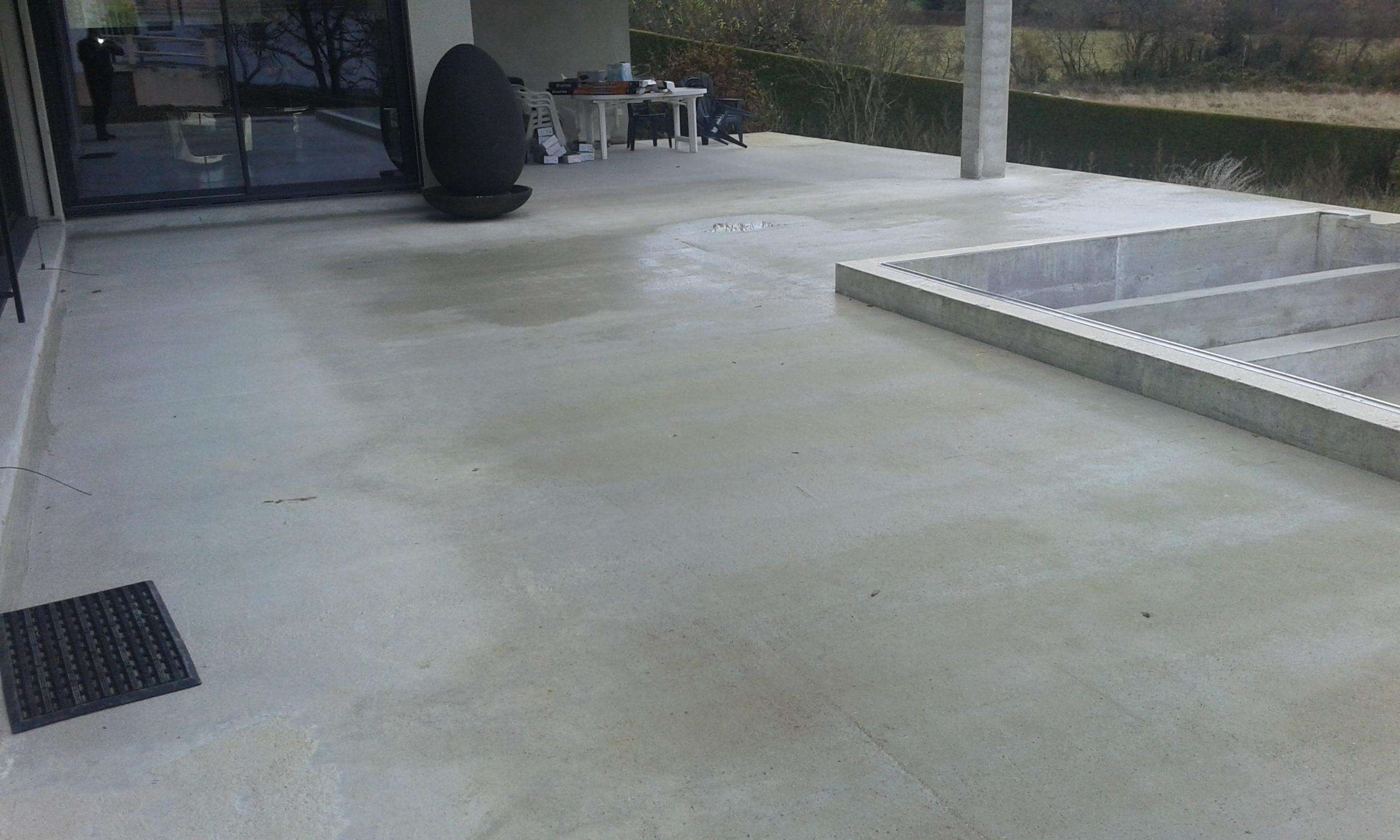 Le sol en périphérie hors bassin est considéré stable. Un simple textile occultant, déroulé à même le sol sous la surface de la terrasse, permet la non-reprise de toute pousse végétale.